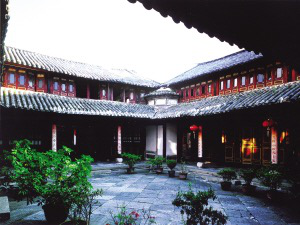 云南大理市喜州“四合五天井”院落。白族將一幢三開間二層的房屋稱為“一坊房子”。一坊房子是普通百姓最常見的住房,即底層三間一明兩暗,明間為堂屋,安設(shè)六扇花格門。兩側(cè)次間為臥室,設(shè)單扇門和格扇窗,前面有臺階和寬敞的廈廊。樓上三間敞通,一般不隔間,依房柱分區(qū)域,面對天井設(shè)格扇窗。中間明間靠后墻設(shè)神龕,里間當書房,放書柜和書桌,人口多的也放床當臥。