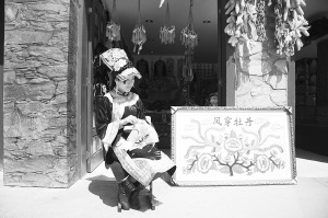 午后,張國麗文文靜靜地坐在店前刺繡,繡帕上是一對鮮活的鴦鴦?!盀t灑、飄逸、俊秀是張國麗刺繡創(chuàng)作的風(fēng)格,許多來旅游的人都是這樣評價的。她獨樹一幟,盡情彰顯了羌風(fēng)羌韻?!痹樠鄧烂C認真地解說。