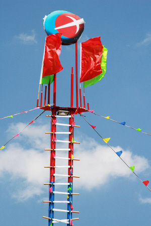 2011年,緬甸傈僳學(xué)會(huì)在密支那舉辦了第一屆世界傈僳闊時(shí)節(jié),第一次將十幾米高的弩弓木雕作為會(huì)徽。該木雕高高聳立于密支那郊區(qū)闊時(shí)節(jié)會(huì)場(chǎng),還有印有傈僳族徽的紅旗插滿(mǎn)會(huì)場(chǎng)四周,高高飄揚(yáng),與巨型木雕相互輝映,構(gòu)成了一個(gè)以弩弓木雕為核心,族徽紅旗環(huán)繞的闊時(shí)節(jié)會(huì)場(chǎng)空間。其內(nèi)其外,傈僳族空間與非傈僳族空間區(qū)隔明顯。