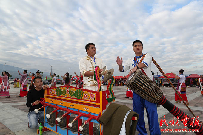 傣族小伙兒敲起傣族樂器象腳鼓及铓鑼、傣镲慶祝新年的到來