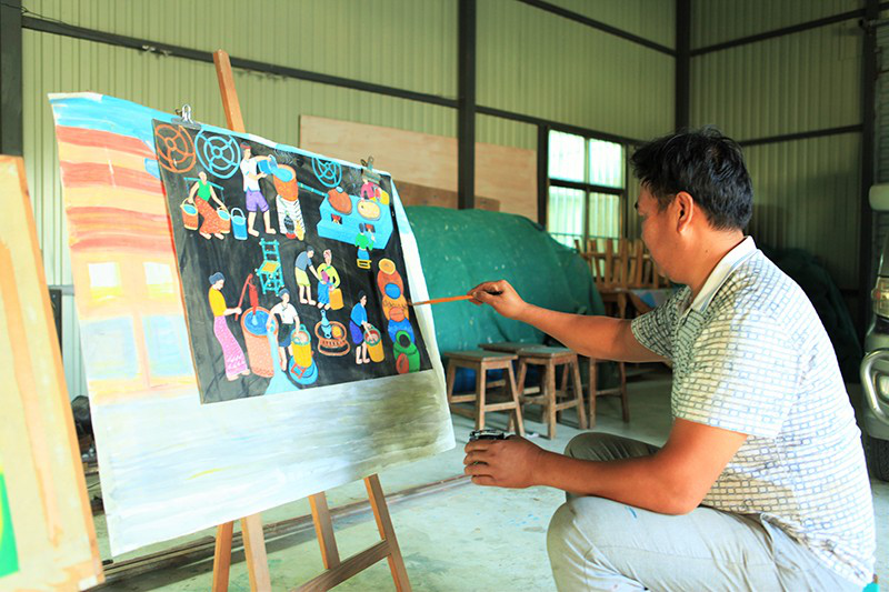喊沙寨的農(nóng)民畫(huà)家吞也正在作畫(huà),畫(huà)中描繪的是傣族群眾的釀酒過(guò)程