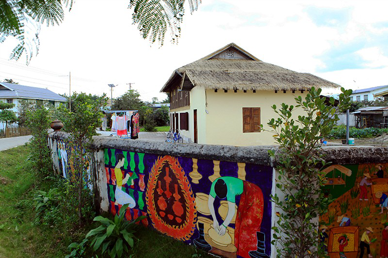 喊沙寨里的彩色畫(huà)墻和傣家竹樓