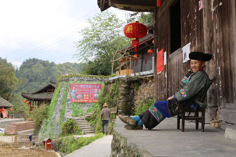 石拔三大媽的家位于村口,老人正在院子里曬太陽。這里的苗族習(xí)俗保持得很好,村民日常生活中大多是苗族傳統(tǒng)打扮。大媽頭裹黑帕頭、穿一件綠色繡花苗裝,利落得很。見來了客人,她趕緊把我往屋里讓。