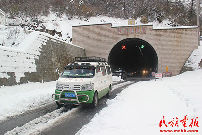 2014年4月獨龍江公路高黎貢山隧道貫通,農村客運車輛在鋪滿雪花的路上駛進駛出