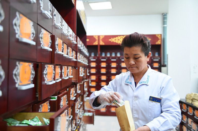 內(nèi)蒙古國際蒙醫(yī)醫(yī)院蒙藥師在藥房抓藥