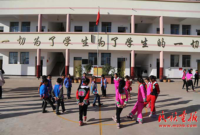 看過臘灣民族小學課間操的人都會說:“臘灣民族小學的課間操都是跳出來的?!比欢瑢τ谶@所雙語教學的民族小學來說,其民族特色遠不止于此。穿彝族傳統(tǒng)服裝、講彝語也是這里的教育特色。