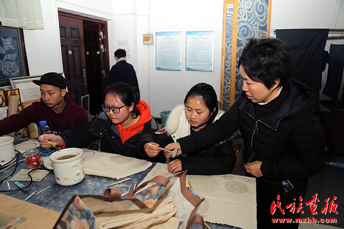 吳安麗老師(右一)在凱里學院藝術(shù)學院蠟染實訓(xùn)室指導(dǎo)學生
