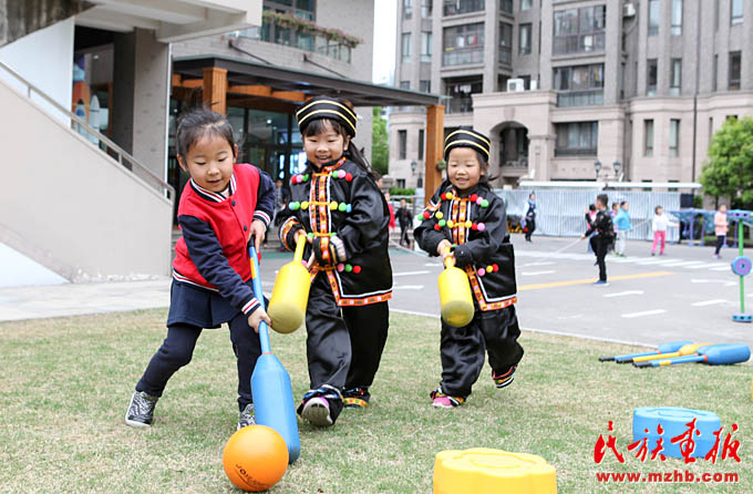 畬族的“摘柿子”、維吾爾族的“賽馬”、黎族的“跳竹竿”、蒙古族的“射箭”……天恒名都幼兒園的操場上,孩子們正積極參加各種民族游戲活動,沉浸在無憂無慮的快樂中。4月13日,是上海市莘莊工業(yè)園區(qū)天恒名都幼兒園的“民族接力棒小社團(tuán)”活動日,孩子們非常期盼這每周一次的活動日。
