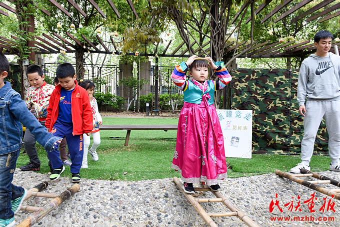 每次活動日,學(xué)校都會從民族傳統(tǒng)游戲中梳理出十多個符合幼兒年齡特點(diǎn)、有助于幼兒身心發(fā)展的游戲內(nèi)容,因地制宜轉(zhuǎn)化成有趣的幼兒民間運(yùn)動游戲。在游戲中,既讓孩子們體驗了運(yùn)動樂趣,又傳播了民族知識。這些富有童趣的游戲,深受孩子們喜愛。
