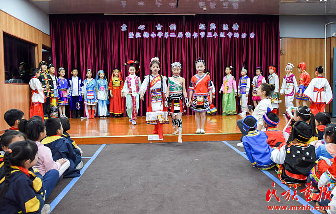 同一天下午,一場精彩的T臺秀在上海市閔行區(qū)梅隴鎮(zhèn)弘梅小學(xué)上演。小學(xué)生們身著民族服裝亮相,動感的音樂、精彩的表演,將“民族團(tuán)結(jié)一家親”的理念演繹得生動活潑。學(xué)校布置的民族文化墻上,展示了我國56個民族的風(fēng)土人情,營造了多姿多彩的民族文化氛圍,讓民族特色文化陪伴在學(xué)生身邊。
