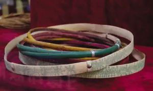 直到今天,腰箍仍在德昂族服飾中占有重要位置。按德昂人的習(xí)慣,姑娘成年后,就要在腰部佩上若干腰箍。這些腰箍大多用藤篾編成,藤圈寬窄粗細(xì)不一,有的漆成紅、黑、綠等色;有的刻上花紋,包上銀皮、鋁皮;還有的一半是藤篾,一半是銀絲。姑娘們以腰箍多、腰箍美為榮。因此,在戀愛期間,小伙子為了討姑娘歡心,往往費盡心機地制作精巧的腰箍相贈。腰箍從傳說的用來“拴住人”,演變成為用來“拴住心”。