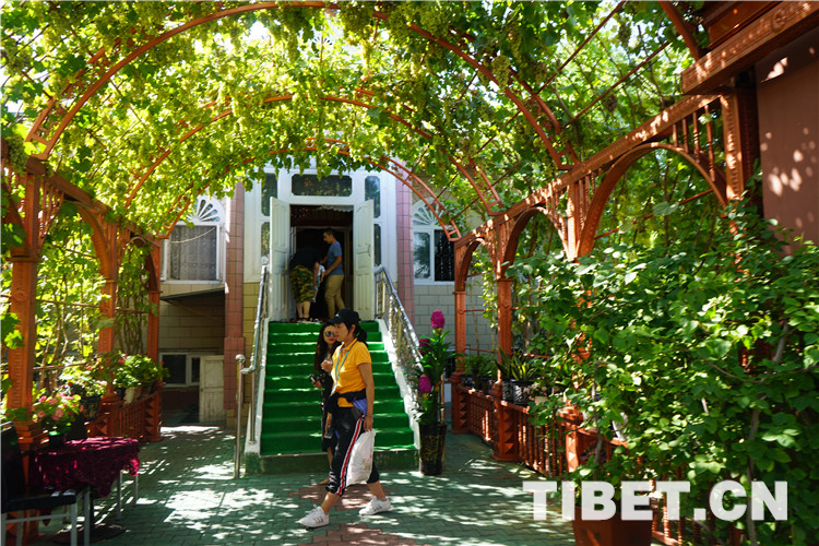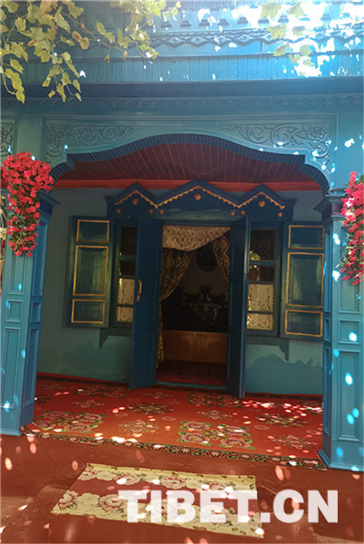 除了古老的純木質(zhì)結(jié)構(gòu)民宿,喀贊其還有各式磚石結(jié)構(gòu)的民居。院落寬敞明亮、華麗氣派,家家種植著花草、蔬菜,郁郁蔥蔥、生機(jī)盎然,葡萄廊架已成為每家的“標(biāo)配”,葡萄架下是家人休閑、朋友聚會的地方。圖為當(dāng)?shù)孛窬釉簝?nèi)。