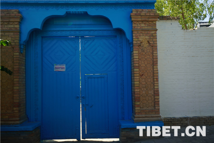 目前,喀贊其仍保留著一定數(shù)量的文物古跡,包括自治區(qū)級文物保護(hù)單位1個(陜西回族大寺),市級文物保護(hù)單位7個,另有12處清真寺建筑。圖為具有當(dāng)?shù)靥厣呐R街藍(lán)色大門。