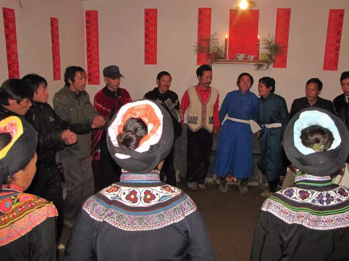 3、源自于宗法禮教。在阿買懇的唱詞中,有阿買懇是君長制定的規(guī)矩之說,根據(jù)彝族典籍文獻記載和民間傳說,反映古代彝族水西君長家和烏撒君長聯(lián)姻嫁娶時,都興阿買懇,說明阿買懇是君長興起這一說法是由根據(jù)的。彝族是一個很重視宗法禮教的民族,各種禮儀習俗和規(guī)章制度比較細密而嚴格,作為人生重大禮儀的婚儀,必然有許多規(guī)矩,阿買懇的幾十項程序性對答吟誦,就足以說明了這一點。但它也并非完全是“君長制定的規(guī)矩”,它更多的是百姓的禮俗和情趣,因為,在阿買懇唱詞中反映的勞動場景的內(nèi)容很多。實事求是的講,阿買懇應該是由君長所倡導和認可,由廣大彝族民眾興起,經(jīng)布摩和民間歌師共同創(chuàng)作、經(jīng)民眾在演唱過程中反復修訂而形成的。