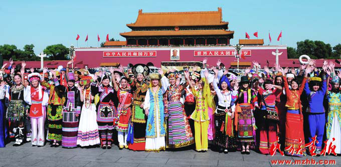 新中國成立以來,黨和國家始終堅(jiān)持把馬克思主義民族理論同中國民族問題具體實(shí)際相結(jié)合,始終堅(jiān)持把民族工作作為一項(xiàng)重大工作來抓,團(tuán)結(jié)帶領(lǐng)全國各族人民共同團(tuán)結(jié)奮斗,共同繁榮發(fā)展,開創(chuàng)了中國特色解決民族問題的正確道路,取得了舉世矚目的成就,積累了彌足珍貴的成功經(jīng)驗(yàn)。2009年10月1日,在北京天安門廣場,20萬軍民以盛大的閱兵儀式和群眾游行歡慶新中國60華誕,圖為各民族學(xué)生參加“團(tuán)結(jié)奮進(jìn)”方陣群眾游行。《民族畫報(bào)》2009年第10期