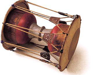 鼓框為木質(zhì),兩面蒙皮,用繩索固定在木框兩邊。鼓鏈木質(zhì),通常在表演中負責敲擊主要旋律的重拍,也有獨奏的情況,聲音有力。
