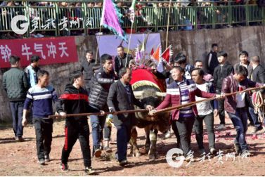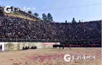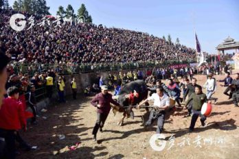 貴州省從江縣第十五屆原生態(tài)侗族大歌節(jié)的前一天,恰逢該縣逢亥斗牛日,丙妹鎮(zhèn)松學(xué)斗牛塘、谷坪鄉(xiāng)四寨河斗牛塘同時舉辦傳統(tǒng)牛王爭霸賽,喜迎一年一度“侗族大歌節(jié)”的到來,共有來自周邊村寨的80頭水牯牛參戰(zhàn),斗?;顒訄錾厦=侵?,場面異彩紛呈,吸引數(shù)萬名觀眾前來觀戰(zhàn)。