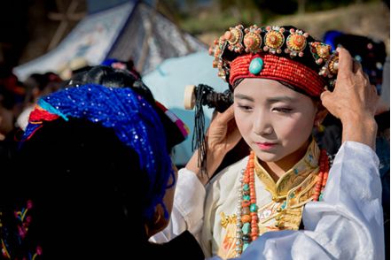丹巴女子的成人禮(成年儀式)有著久遠的歷史,也是一項傳統(tǒng)的選美、賽美活動。成人禮一般以自然村落為單位,由活佛或者吉祥老人選擇吉日或是農(nóng)閑時間舉行。成人禮在藏語中稱為“幾薩”,是“穿成年新裝”的意思。當?shù)貪h語又叫“戴角角”,意指行成人禮的女孩要梳扎像牛角一樣的發(fā)束,造型奇巧別致。小女孩長到16歲行過成年禮之后才算長大成人,才能夠戀愛結(jié)婚。所以,成人禮對每一個嘉絨姑娘來說都是人生歷程中的一件大事。嘉絨藏族非常重視對后代的教育,女人是部族的靈魂。所以女子成人禮充分體現(xiàn)嘉絨藏族關(guān)愛后輩、尊重女性的民間習(xí)俗,具有強烈的地域特色,顯現(xiàn)出鮮明的個性特點和母系氏族社會文化的基因。
