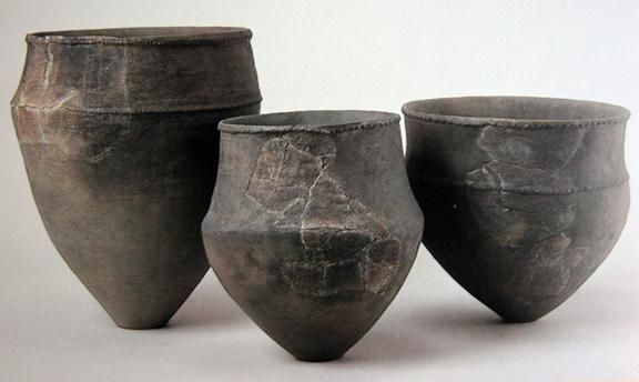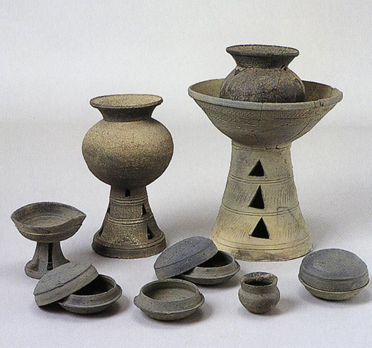 彌生時代的名稱,源自1884年東京市本鄉(xiāng)彌生町“彌生陶器”的發(fā)現(xiàn)。彌生陶器與繩紋陶器截然不同,為素面,灰色。日本人認(rèn)為彌生陶器是“渡來人”制造的。“渡來人”是中國大陸通過朝鮮半島而來,他們帶來了陶器的制作技術(shù)。彌生陶器為深釜器,以甕形器、缽形器、高腳杯(豆形器)為主(圖五)。