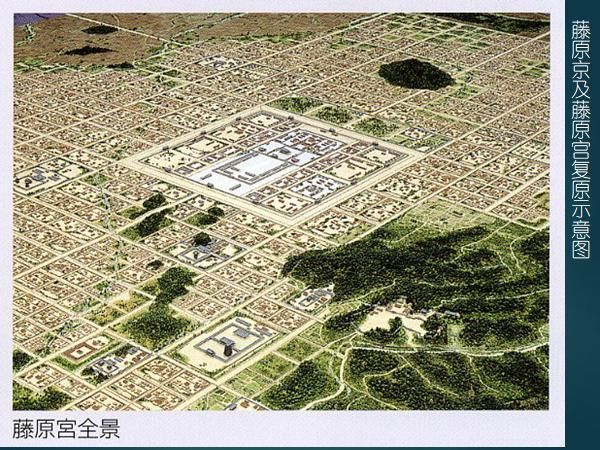 飛鳥-奈良時代對作為中央集權(quán)國家的象征的都城建設(shè),極其重視。藤原京是持統(tǒng)、元明、元正三代天皇延用了16年的都城遺址,這個遺址經(jīng)過幾十年的考古發(fā)掘,已經(jīng)探明了藤原京和藤原宮的范圍及布局(圖二十)。京城東西及南北各長5.3km,平面近正方形,宮城在其中央,這點與唐長安城不同。有學(xué)者認(rèn)為,藤原京是以《周禮》規(guī)定的理想化都城建制為依據(jù)所筑成的。