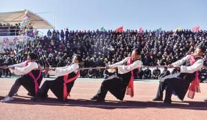 2020年11月29日,為期三天的西藏自治區(qū)山南市扎囊縣首屆農(nóng)民運(yùn)動(dòng)會(huì)在扎囊縣體育公園進(jìn)行。抱石頭、套麻袋、氆氌纏線等多項(xiàng)趣味十足的運(yùn)動(dòng),吸引了來(lái)自扎囊縣5個(gè)鄉(xiāng)(鎮(zhèn))、62個(gè)行政村(居)的450多名農(nóng)牧民運(yùn)動(dòng)員參加角逐。每年冬季,雅魯藏布江流域的西藏農(nóng)村進(jìn)入農(nóng)閑時(shí)期,當(dāng)?shù)剞r(nóng)牧民就迎來(lái)了一年中難得的休閑時(shí)光。圖為農(nóng)牧民運(yùn)動(dòng)員在進(jìn)行拔河比賽。