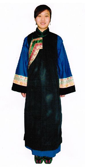 科爾沁蒙古袍款式較合身,長(zhǎng)袍下擺窄且開(kāi)衩。格外注重刺繡裝飾、穿偏開(kāi)襟長(zhǎng)坎肩、工藝精湛的尖頭靴和已婚婦女發(fā)髻式珊瑚頭飾等是科爾沁服飾最顯著的特征。