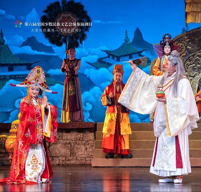 9月14日,作為第六屆全國少數(shù)民族文藝會演參演劇目,由青海省選送、青海省藏劇團(黃南藏族自治州民族歌舞劇團)創(chuàng)作演出的藏戲《意卓拉姆》在央視網(wǎng)和國家民委門戶網(wǎng)站進行演播。該劇講述了傳說中的仙女意卓拉姆與人間的諾桑王子相愛,歷經(jīng)挫折與磨難后終成眷屬的愛情故事,表現(xiàn)出意卓拉姆對愛情的忠貞不渝和諾桑王子堅韌不拔的意志。