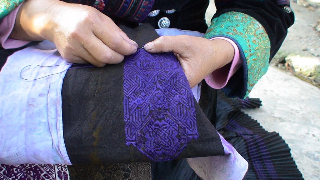 服裝的挑花刺繡均是依照布料的經(jīng)緯戳針,在繡法上多有變化,如平繡、數(shù)紗繡、織繡等,其紋樣層層疊套,圖案工整對稱,其繡技與織技完美統(tǒng)一,巧奪天工,具有很強(qiáng)的立體感。體現(xiàn)了苗族獨(dú)特的正挑反針挑花、刺繡、織繡等精湛工藝。