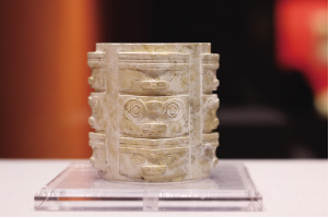 位于浙江杭州余杭區(qū)的良渚遺址,是考古實證中華文明史的典范。良渚文化玉器發(fā)達,玉琮和玉璧是其重要代表。展覽中的這件玉琮出土于反山遺址12號墓,內(nèi)圓外方,器型規(guī)整,共有三節(jié),雕刻簡化的神人獸面紋,紋飾類似后世青銅器“三層花紋”,制作工藝已使用拉絲、管鉆、鋸切等技術(shù),減地淺浮雕手法,滿密的陰線刻,精細(xì)的器表打磨剖光技術(shù),均表現(xiàn)了良渚玉器的高度成就。