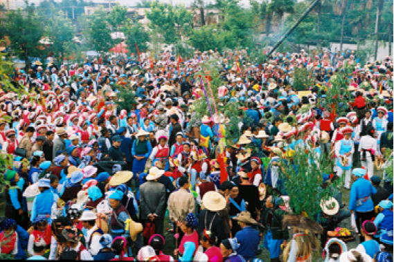 “繞三靈”活動的特點,除了向本主神靈祈求風調雨順的內容之外,主要在于其歌舞活動所表現(xiàn)的男女情愛無所顧忌,放達不拘。每個歌舞隊列領頭者均為男女巫二人,他們以一手共執(zhí)一株齊人高的樹枝,另一手分別揮舞牦牛尾和花手巾,邊舞邊唱,引領著隊伍緩緩前行。樹枝上掛著紅綢系著的葫蘆,據(jù)說葫蘆象征母腹,紅綢象征陰血。他們口唱的調子稱“活恩枯”直譯為“花柳曲”,一唱一和,幽默風趣。其后的歌舞隊列,唱的也都是充滿艷情的調子,跳的是霸王鞭和八角鼓舞,舞姿多有男女背靠背、心合心、腳勾腳等形式,無拘無束地表達著熾熱的情感。