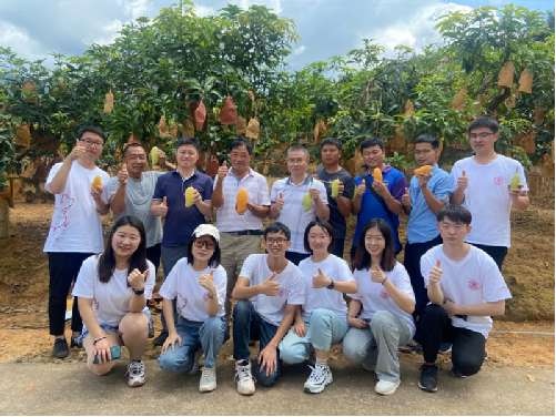 一是恩樂鎮(zhèn)復(fù)興村晚熟芒果基地調(diào)研。9月3日上午實(shí)踐團(tuán)前往恩樂鎮(zhèn)復(fù)興村晚熟芒果基地考察,了解該基地的主要栽培品種,提出當(dāng)?shù)孛⒐耘嗟膬?yōu)勢及目前亟需解決的問題,并為農(nóng)戶進(jìn)行相關(guān)栽培技術(shù)的講解,為當(dāng)?shù)赝硎烀⒐?xì)化管理提供技術(shù)支撐。同時實(shí)踐團(tuán)選取不同海拔生長旺盛、豐產(chǎn)、穩(wěn)產(chǎn)的成年樹,隨機(jī)采摘果形均勻、健康飽滿、無機(jī)械損傷和病蟲害的成熟果,以及套上不同果袋子的果實(shí),如白袋、紅袋和黃袋,所有樣品采摘后立即送回實(shí)驗室,對其單果重,果實(shí)縱徑、橫徑、厚度、總可溶性固形物、果形指數(shù)及風(fēng)味等綜合性狀進(jìn)行測定,探究不同海拔和果袋對芒果果實(shí)品質(zhì)的影響,以期為生產(chǎn)實(shí)踐提供理論指導(dǎo),提高果實(shí)品質(zhì)。