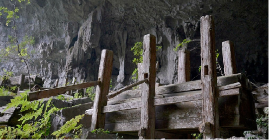 果里巖洞葬位于貴州龍里縣擺省鄉(xiāng)果里村東1公里煤洞坡的洞穴中,地處巖溶山原,峰叢林立,喬灌間雜。該洞在山頂下四十米處呈南北向橫穿山體,長580米,寬為38—65米,高為21—50米,有兩個入口;北面入口,寬54米,高21米,;南面入口,寬35米,高45米,有三道石砌墻垣。洞中地勢內(nèi)斜平緩,洞內(nèi)干燥,能見度好,入口處地勢外斜。據(jù)查,果里的苗族于明朝初期從貴陽遷徙而來。從遷徙之初至清末,他們均習(xí)慣將亡者殮于棺木集中存放在洞穴之內(nèi)。在洞穴北面入口3000平方米的范圍內(nèi)現(xiàn)存完好的棺木有192具,腐朽散落及其它原因損毀的約200余具。棺木材質(zhì)為杉木。棺木有平板平頭和鼓型雄頭之分,其大小因亡者的體型而定。平板平頭型棺木制作粗糙,長1.45—2.23米,寬0.46—0.75米,高0.46——0.9米;鼓型雄頭棺木多為杉木本色,長1.5—2.23米,寬0.48—0.8米,高0.5—0.9米。棺木一律頭向北面入口,均固定于兩個或三個“井”字架上;三個“井”字架表明亡者為男性,兩個“井”字架的為女性。棺內(nèi)亡者頭靠凹型木枕。平板平頭棺為明代,鼓型雄頭棺為清代。