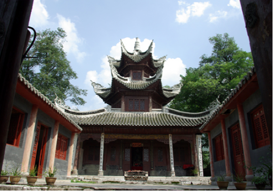 冠山,位于貴州龍里冠山盆地(縣城)東隅,巖山形似金鐘撲地,古木參天,蔥郁蒼翠。明永樂七年(1409)始建的道教活動場所掩蔽其中,可謂“山不在高有仙則名”。在歷史的長河中,雖然道教一去不復(fù)返,但其紫虛觀主體建筑保存尚好,現(xiàn)列為省級文物保護(hù)單位,由主體建筑紫虛閣、左右?guī)俊⑶暗?、山門、文昌祠組成二進(jìn)院式古建筑群。主體建筑為木構(gòu)穿斗式三重檐六角攢尖筒瓦頂,1989年遷入的文昌祠,為木構(gòu)抬梁式歇山青瓦頂,帶吻正脊,戧脊翹角卷草,石質(zhì)柱礎(chǔ)浮雕仙草、竹、梅、鹿等圖案。西南兩面有1936年題刻的“還我河山”、“巨靈一孹”等七方摩崖石刻。建筑物的形制、布局給人一種古樸、滄桑之感。登閣騁目,遠(yuǎn)山峻嶺和鱗次櫛比的樓房盡收眼底,讓人流連忘返。