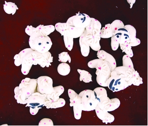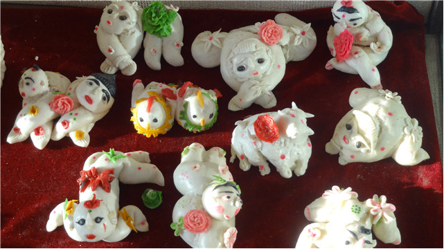 1、春節(jié)(過大年)來臨前,家庭婦女用白面捏制小狗、小貓、玉兔、魚娃娃、蓮花的面塑制品,上面點(diǎn)綴紅棗、花生等。以象征萬事如意,多福多壽、家庭和睦。