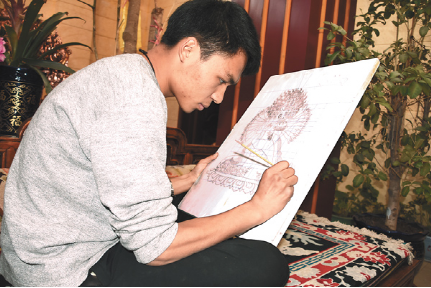 技藝上的登峰造極,次嘎把這一秘笈歸結(jié)成幾個(gè)平常的字眼:“興趣和堅(jiān)持”。從小受家族文化的熏陶,兩個(gè)兒子對(duì)傳統(tǒng)文化有著濃厚的興趣。薪火相傳也成了次嘎肩上的責(zé)任。20出頭的大兒子扎西拉達(dá)穿著白T恤,皮膚白皙、手指纖長(zhǎng)、陽(yáng)光帥氣,立志要子承父業(yè)?!案赣H告訴我即便是要做一名手工藝人,也不能放棄對(duì)文化知識(shí)的學(xué)習(xí),從小便把我送到內(nèi)地學(xué)習(xí)。現(xiàn)在,我長(zhǎng)大了,該回來(lái)了?!?扎西拉達(dá)的話語(yǔ)堅(jiān)定。