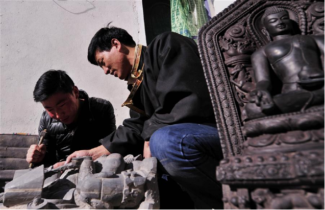 伴隨著收音機(jī)傳出的旋律,西藏自治區(qū)級黑玉石雕刻技藝非物質(zhì)文化遺產(chǎn)傳承人土登加措和他的徒弟們開始了又一天的黑玉石佛像雕刻工作。黑玉石產(chǎn)生于海拔4500米以上的石山上,是高原特有的一種石材。據(jù)古書記載,西藏第一代藏王聶赤贊普曾將天降的經(jīng)書、塔模等佛教圣物封存于洞中,并以黑玉石雕刻佛塔做蓋,于是便有了西藏歷史上有記載的第一件黑玉石雕刻作品。作為這門技藝的第五代傳人,土登加措延續(xù)著家族的技藝,一直傳承著這門古老的技藝。西藏黑玉石雕刻技藝在2012年入選第四批西藏自治區(qū)級非物質(zhì)文化遺產(chǎn)名錄,土登加措如今已有近30名弟子,古老的黑玉石雕刻技藝正在慢慢走向世界。新華社記者 晉美多吉 攝