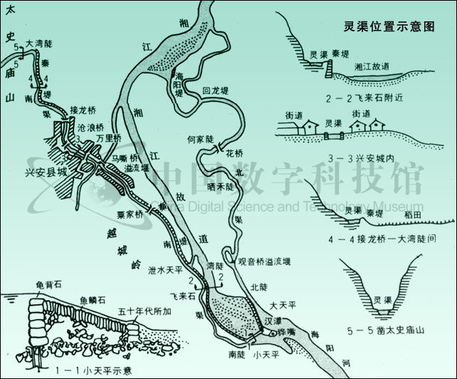 靈渠,又名零渠。以其曾部分利用靈(零)河水系的原有河道,故名。因開(kāi)鑿于秦,一名秦鑿渠。又因位于今廣西興安縣城附近,故近代或稱(chēng)之為興安運(yùn)河。靈渠是一條連接湘江與漓江的人工渠道,主要由鏵嘴、大小天平石堤、南渠和北渠等工程構(gòu)成。鏵嘴是修建在湘江中的分水壩,用巨石疊砌而成,前銳后鈍,形似犁鏵,這是引湘入漓的關(guān)鍵工程,它有效地使湘江一分為二,一支順南渠入漓江,一支沿北渠回流入湘江。南、北渠總長(zhǎng)三十四公里,是靈渠的主體結(jié)構(gòu),是貫穿湘、漓二水的通道。在鏵嘴尾端還筑有“∧”字的大小天平石堤,起著蓄水、溢洪,調(diào)劑水量的作用,能保證整個(gè)工程發(fā)揮正常的效益。