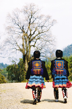 白褲瑤女人身上最惹眼的,除了百褶裙,還有她們衣服背后那一個個大大的方形圖案。傳說900年前,白褲瑤首領有一方皇帝賜給的權印,被女婿以哄孫子為借口,借走并用假印調了包,瑤族人因此被趕進山里,過起了少田缺水的游耕生活。為了告誡子孫不要忘記因為喪失權力而導致苦難的教訓,從此,白褲瑤就在女人的馬鞍衣后面,繡上了一個形狀像首領印一樣的彩色方塊圖案。這是一種紀念,也是一種懷念。裙擺拂過落葉,一如群蝶穿越花叢。