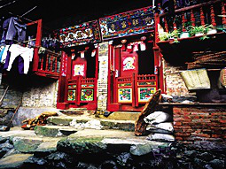 在大門至內(nèi)廳的上面用木板鋪成樓層,臥室在二樓,也放糧食和雜物。屋內(nèi)左右山墻即是戶與戶間的隔墻,在墻中分別開(kāi)有特殊的小門,鄰居互通,稱“隔門”。隔門平時(shí)關(guān)閉,遇特殊情況時(shí),村中各戶都打開(kāi)隔門,變成室內(nèi)通道,自由來(lái)往,整個(gè)村寨就是一座城堡。