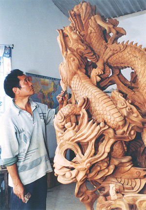 今年54歲的李元生,以雕龍而遠近聞名。早在上個世紀80年代初,他創(chuàng)作的第一件根(木)雕作品《困龍也有上天時》,便被一位游客購買收藏。在近20年的時間里,一些常人眼里只能當柴燒的樹根,在他獨特的構(gòu)思和飛舞的刻刀中,變成了上百件大小不一的富有生命力的根(木)雕作品。其中的代表作有:《九龍傳說》、《送子觀音》、《長壽九千年》、《金龍獻寶》、《哪吒鬧?!贰ⅰ叮保梗梗埂伺c自然》等。這些作品,不少被省內(nèi)外的單位和個人作為珍品收藏。