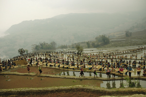 上午10點,由上千名當?shù)毓嶙遛r(nóng)民和彝族農(nóng)民組成的表演團隊,在20平方公里之廣袤的梯田間開始載歌載舞,展現(xiàn)當?shù)氐纳贁?shù)民族放牛、插秧、抓魚、婚禮等生產(chǎn)生活方式。梯田、森林、村莊、河流在1小時的演出中渾然一體,征服了當?shù)厝罕姾蜕锨型庥慰汀?/p>