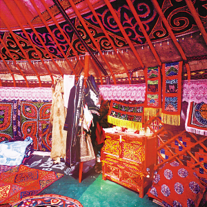 氈房外觀通常樸實(shí)無華,門框由松木做成,上面雕刻花紋或繪制圖案,一塊鮮艷奪目的掛毯吊在門上。房內(nèi)富麗堂皇,布置合理,前半部分堆放日用物品,后半部分待客、住人。