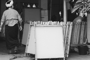澆紙是在紙槽中進行的,不但需要強勁的臂力,還需要相當?shù)募毿?。在紙槽中舀水的時候,雙臂承受的重量不下10公斤,紙要澆得恰到好處,澆輕了紙就太薄,澆重了紙又太厚。太薄出不了好品相,太厚會增加成本。這是整個構紙成品的關鍵,經驗老到的傣族老人,都不會在這道工序上馬虎。一雙手游走在澆紙槽,或輕輕拍打,或慢慢游弋,絮狀的纖維時而附著在手上,時而又歡呼雀躍地散開,頑皮得有點像芒團村水塘邊遇上的那些孩子。憑感覺均勻了,老人這才輕輕將澆紙盤脫離水面,一眨眼功夫,一張構紙便在盤上現(xiàn)出端倪。接下來的事就交給陽光了,如果雨季來臨,構紙就停止生產。所以說,芒團構紙常常浸漬著一種陽光的味道。