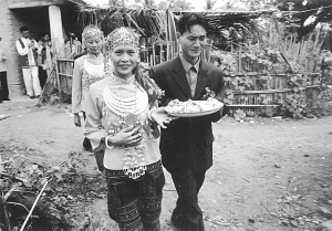 上午10點,新娘要“回返”娘家。伴娘挑著兩只籮筐,一邊放有糯米和豬肉,另一邊放著一件衣服。這件衣服只能是黑色或藍(lán)色,不能是花色和白色。據(jù)說花衣服新娘穿了會花心,白色則不吉利。這件衣服是婆婆特地送給新娘的,今后一定要穿。新娘和伴娘一起走在回返的路上,新娘舍不得離開婆家,走到村口,就把糯米飯和豬肉分給過路人吃,以示新娘的熱情好客。我也吃了籮筐里的糯米飯和豬肉,覺得很香,很好吃。之后,新娘和伴娘不再往娘家走,而是返回了婆家。