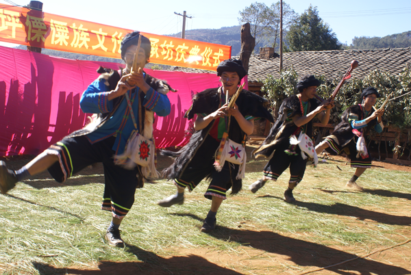 節(jié)日里,婦女們穿著鑲花邊的黑色上衣和點(diǎn)綴著各種銀飾物的花裙,佩戴耳環(huán)、項(xiàng)鏈等首飾,風(fēng)采奪人。男人穿著麻布短衣褲,腰系紅黃長(zhǎng)帶,小腿系吊簡(jiǎn),腰佩長(zhǎng)刀,肩挎箭包,英姿勃勃。節(jié)目的廣場(chǎng)上,堅(jiān)趄兩根二十米高的樹(shù)干,四周用藤蔓拉緊固定,樹(shù)桿上插有三十六把明晃晃的長(zhǎng)刀,作為向上攀登的橫檔,刀刃向上,寒光逼人,謂之“刀竿午間。鞭炮齊鳴,鑼鼓震天”。身穿大紅抱、頭纏紅布包頭、赤腳的五名“玩火者”,齊涌至竿下,圍繞刀竿唱歌跳舞,將斟滿(mǎn)的白酒一飲而盡,縱身飛上刀竿。雙手緊提刀面,運(yùn)足氣的腳掌斜置在鋒利的刀刃上,勇敢、靈巧地向上攀登。全場(chǎng)鴉雀無(wú)聲,大家屏住呼吸仰面觀看,對(duì)他們的氣功絕技贊嘆不已。噼噼啪啪的鞭炮聲來(lái)自竿頂優(yōu)勝者,響徹云霄。全場(chǎng)歡呼跳躍,爭(zhēng)相向爬桿者敬獻(xiàn)美酒。對(duì)歌、跳舞、蕩秋千活動(dòng)為節(jié)日增添了濃郁的氣氛。丟煙包(煙盒)活動(dòng)別具一格,青年男女各站一方,互擲煙包,姑娘將小伙的煙包收藏起來(lái),說(shuō)明姑娘接受了小伙子的愛(ài)慕。