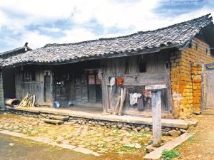 隴川縣戶撒鄉(xiāng)曼旦寨是阿昌族古老的村寨之一,明、清時期的老宅皆以楠木建造,數(shù)百年不朽、無蟲蛀。受漢族文化影響,傳統(tǒng)民居大都是土木石結(jié)構(gòu)的三合一照壁或四合院落。正房建在長方石條加土方壘起的屋基上,屋基下為院壩,以三層石階上下。正房三開間,四排五柱,中柱起脊,形成雙斜面屋頂,上覆凹型青瓦。后墻和兩側(cè)山墻以土坯砌筑,外面不抹泥,左右是廂房或照壁。室內(nèi)隔墻均為木板,中間一間為堂屋,有一米多寬的吞口,六扇雕刻的木板門,平時只開中間兩扇。兩邊的檐柱頭有粗獷的木雕。吞口有走廊的作用,一般左側(cè)角設(shè)臉盆架以供洗漱,板壁上掛小鏡框以便梳妝,旁邊掛著家人的照片。有的擺著縫紉機,有的放藤椅小憩。右側(cè)放臨時的農(nóng)具,掛衣服,板壁上貼著影視明星的招貼畫。堂屋正面板壁是通高的木雕佛龕,供奉佛像和傣文的經(jīng)文,龕楣上貼著三至四層掛錢,下面有燭臺、香爐。左側(cè)擺著電視機、熱水瓶、茶桌,板壁上掛著戶撒刀和手工編織的背兜,右側(cè)有專供老人休息的床或藤椅,也有的砌火塘,火塘的小土臺上放著炒菜的調(diào)料、火柴和照明燈具。