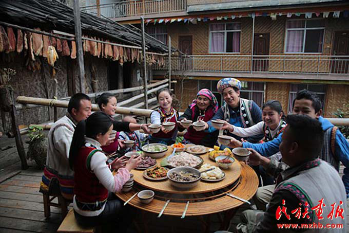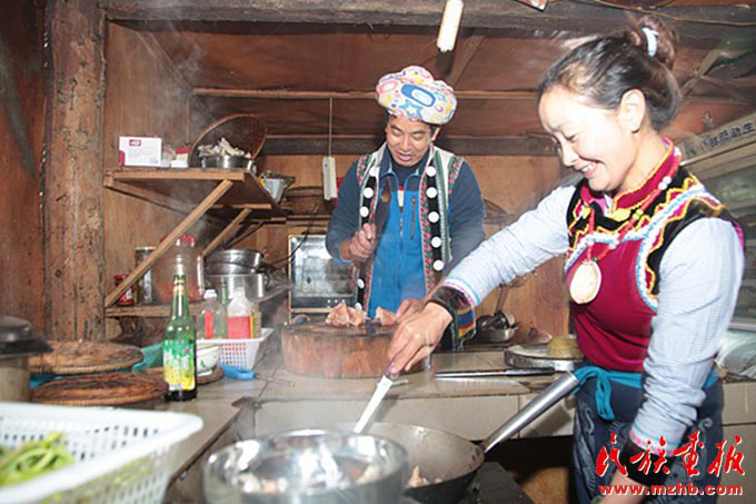 早上,老姆登村73歲的怒族老人斯普早早起來招呼兒子郁伍林、兒媳魯春花:“春節(jié)快放假了,客棧的生意會(huì)忙得不可開交,趁著現(xiàn)在客人不多,家里人先吃一頓團(tuán)圓飯吧?!彼蛊绽习樵缒赀^世,7個(gè)兒女中老五郁伍林在身邊照顧她?!斑^去在春節(jié)才能吃上一頓好飯菜,也要準(zhǔn)備很長時(shí)間,現(xiàn)在每天都有好吃的,天天在過年,多虧了黨的好政策。”說起今天的幸福生活,生在舊社會(huì)的斯普感慨萬千。
