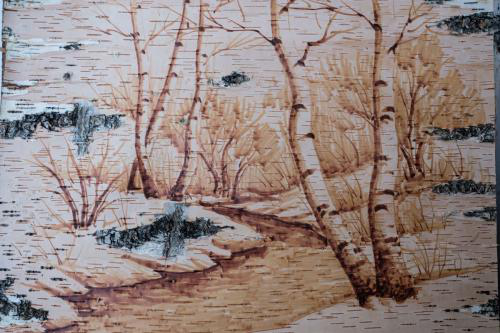 在制作樺樹皮畫之前,要先對樺樹皮進行剝離、儲存和處理,每年陰歷5~6月份是剝采樺樹皮的最好時節(jié),因為此時的樺樹正處灌漿期,樺樹皮與樹干之間充滿水分,樺樹皮最易剝落而不又不會傷及樹干。剝下來的樺樹皮因自然特性,剝下來就是呈表面在外,內(nèi)面朝里的卷曲狀態(tài),但如果任由這種狀態(tài)保存,作畫時就不能保證畫面平展了。所以,樺樹皮從剝落開始就要反自然狀態(tài),使表面朝里、內(nèi)面朝外卷捆。人們在冬天為了更好保持樺樹皮的柔軟度,會對其用熱水進行漂洗。一般在春、夏、秋季三季,漂洗過程就沒有必要了。樺樹皮畫的工藝流程大致為:選材——固定背板——揭皮——碳化繪制——題詞加印——涂油——表框。樺樹皮畫用的不是樺樹皮內(nèi)里,而是表里。由于樹皮表面粗糙,呈自然形態(tài),要進行創(chuàng)作,就必須揭去表皮,并通過碳化過程進行作畫。完成畫作后,為了是畫面光滑,尚需擦油。在樺樹皮畫制作過程中運用到三種制作技術:揭皮技術、碳化技術和涂油技術。