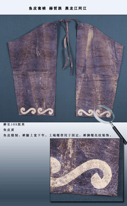 套褲的形式只是兩個(gè)筒形褲腿,沒有褲腰,男式的上端為齊口,女式的上端為斜口。赫哲族人稱男式魚皮套褲為 “臥又克衣”,褲邊口有皮條,是用來扎結(jié)用的。赫哲族人稱女式魚皮套褲為“嘎榮”,口呈月牙形狀,前邊到腰部,后邊到大腿根部。如圖所示,女式魚皮套褲,長(zhǎng)105厘米,褲腿上寬下窄,上端系有綴帶,褲腳綴有“S”形紋飾。魚皮褲造型與普通褲子基本一致,褲腰和褲襠部較為寬松肥大,褲腿稍窄些。