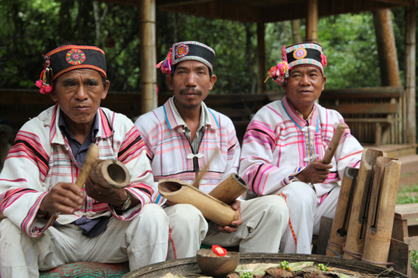 男子身著無領(lǐng)對(duì)襟上衣,多用白底直條紋土布制成,背部縫有繡在白色方塊布上的月亮花圖案。下穿寬大的褲子,長(zhǎng)及膝處,用白色土布綁腿。頭上留三撮發(fā),額前正中一撮,頭頂腦門心兩邊各一撮,但有的村寨只留一撮,有的在額正中,有的在頭頂上,長(zhǎng)約寸許,用寬一尺、長(zhǎng)丈余的黑布纏頭。